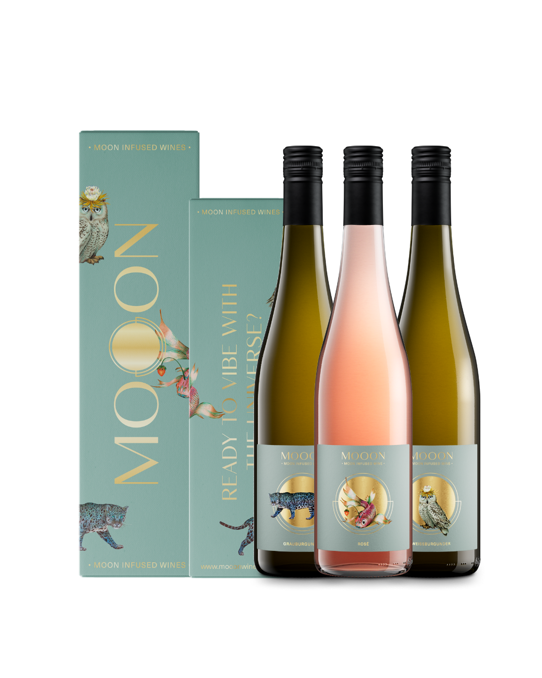 Drei Weine. Geschenke mit Strahlkraft. Grauburgunder, Weißburgunder und Rosé – Leopard, Eule und Fisch. Stärke, Intuition und Leichtigkeit in einer eleganten MOOON Box. Perfekt zum Verschenken oder Genießen. Jeder Schluck trägt die Magie des Mondes.